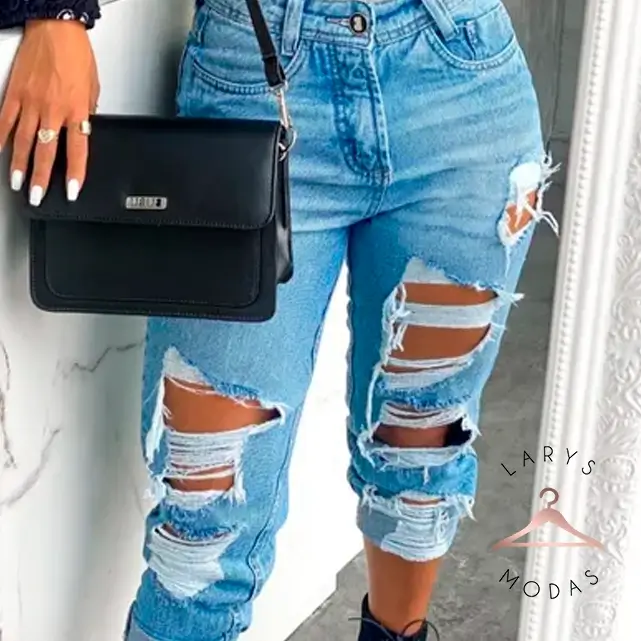 Calça jeans, com elástico na cintura, bolsos frontais em cada perna. Possui presilha para cinto (opcional)