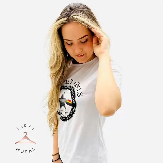 As T- shirts fazem parte do guarda roupa feminino com estilo e conforto de uma peça antes básica hoje essencial, promove destaque á vários looks do trabalho com blazer e calças Skinny e aquele salto lindo a passeios de fim de semana com tenizinho e moletom, essa blusa em algodão possui ótimo caimento com manga curta, gola redonda, linda estampa logo Planet Girls com estrela FASHION FOR YOU. Una estilo e beleza a seu dia adia com uma peça original !
